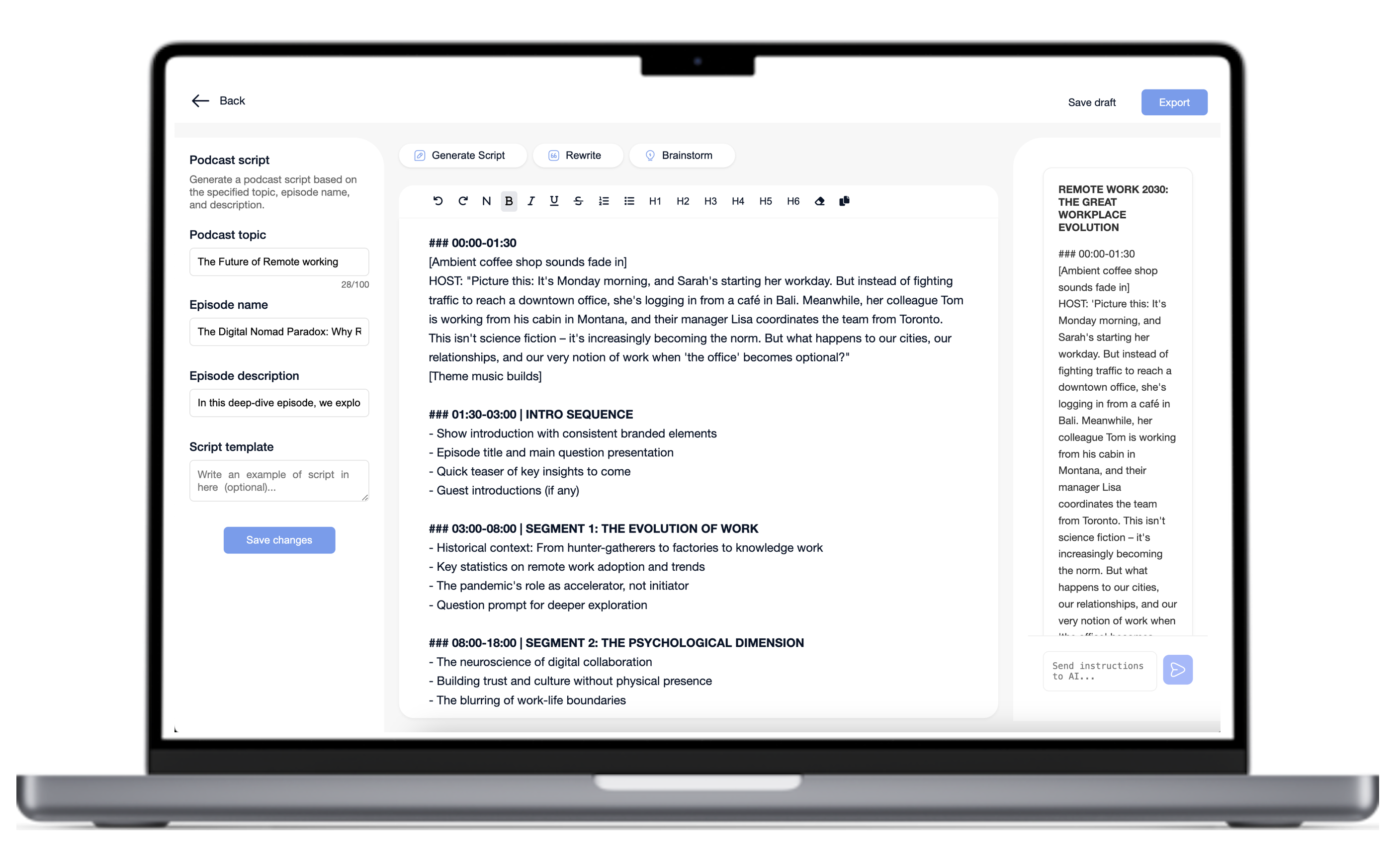 Generate compelling podcast scripts in seconds with our advanced AI model, and refine them in real-time to match your style.